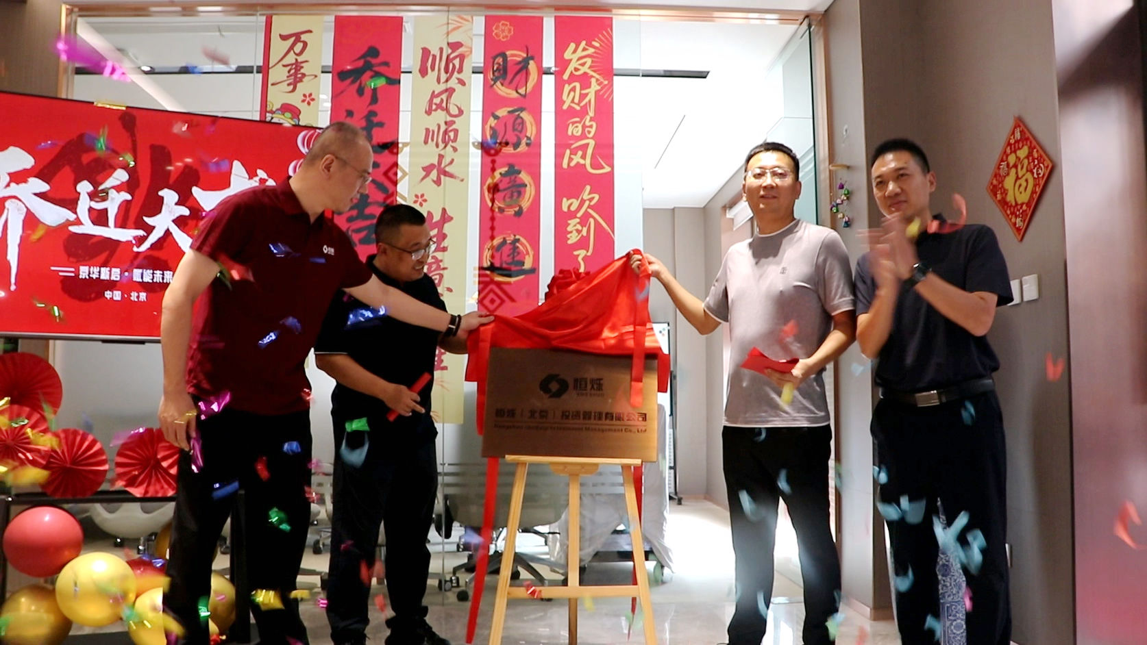 在领导嘉宾与全体同仁的见证下,四位领导共同揭开红绸,为新职场正式揭牌,象征着公司的新征途正式启航,门牌揭开瞬间,礼花纷飞,掌声雷动,现场气氛热烈非凡!