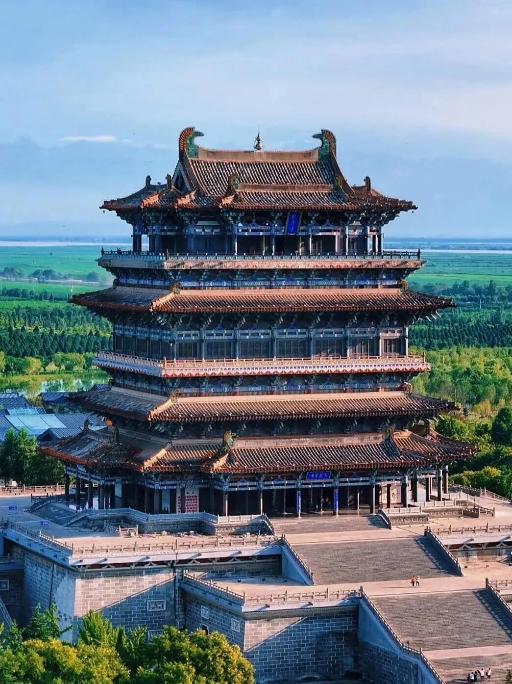 鹳雀楼始建于北周,因常有鹳雀栖息而得名,为古代四大名楼之一。其楼体巍峨,飞檐斗拱,尽显盛唐气象。登楼远眺,黄河如带,浩浩汤汤,中条山峦层叠,苍茫壮阔。王之涣在此留下“白日依山尽,黄河入海流”的千古绝唱,将天地之壮美凝于笔端。